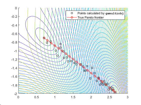 options = optimoptions('gamultiobj','PopulationSize',60,... 'ParetoFraction',0.7,'PlotFcn',@gaplotpareto); lb = [0 -5]; ub = [5 0];