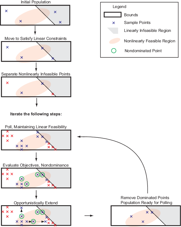 paretosearch опросы очки от iterates, при этом опрошенные точки наследуют связанный размер сетки от точки в iterates. paretosearch алгоритм использует опрос, который поддерживает выполнимость относительно границ и всех линейных ограничений.