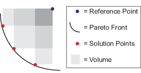| Объем | Гиперобъём множества точек p в пространстве целевой функции, удовлетворяющих неравенству, для каждого индекса j, fi (j) < pi < Mi, где fi (j) - i-й компонент значения j-й целевой функции в наборе Парето, а Mi - верхняя граница для i-го компонента для всех точек в наборе Парето. На этом рисунке M называется опорной точкой. Оттенки серого на рисунке обозначают части объема, которые некоторые алгоритмы вычисления используют как часть вычисления включения-исключения.