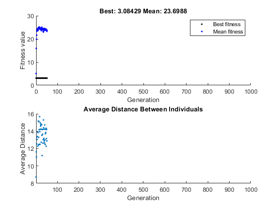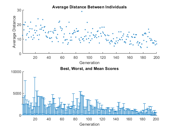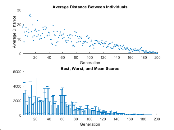 На верхнем графике отображается среднее расстояние между точками в каждом поколении. По мере уменьшения количества мутации уменьшается и среднее расстояние между индивидуумами, которое приблизительно равно 0 в конечном поколении. На нижнем графике отображается вертикальная линия в каждом поколении, показывающая диапазон от наименьшего до наибольшего значения фитнеса, а также среднее значение фитнеса. По мере уменьшения количества мутации уменьшается и диапазон. Эти графики показывают, что уменьшение количества мутаций уменьшает разнообразие последующих поколений.