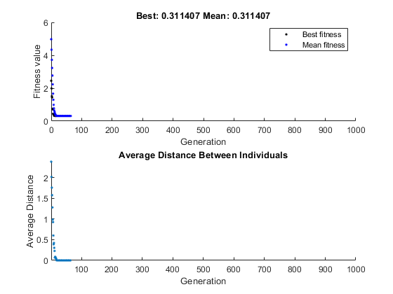 Для этой функции фитнеса установите фракцию Crossover на 0.8 дает лучший результат. Однако для другой функции фитнеса другой параметр для фракции Crossover может дать наилучший результат.