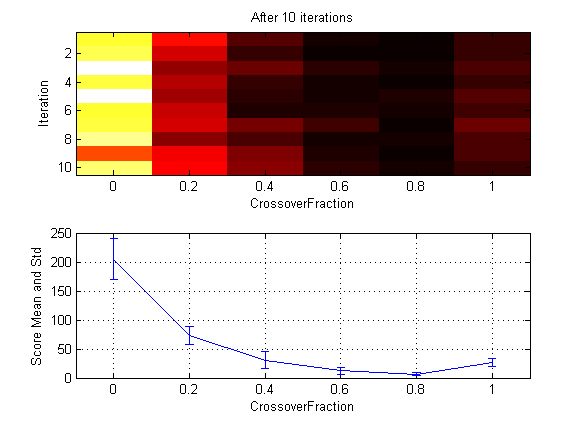 На нижнем графике показаны средние и стандартные отклонения лучших значений пригодности за 10 поколений, для каждого из значений кроссоверной фракции. Верхний график показывает цветовое отображение лучших значений пригодности в каждом поколении.
