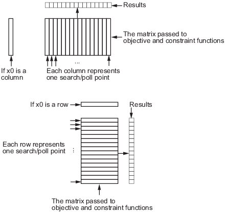 Для функций ограничения используются те же соображения, что и для целевых функций: начальная точка x0 определяет тип точек (векторы строк или столбцов) в опросе или поиске. Если начальная точка является вектором строки размера k, матрица x, переданная функции ограничения, имеет k столбцов. Аналогично, если начальная точка является вектором столбца размера k, матрица точек опроса или поиска имеет k строк. Это может быть ясно показано на рисунке Структура векторизированных функций. Если начальная точка является скаляром, patternsearch предполагает, что это вектор строки.