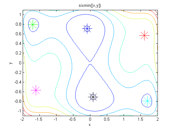 sixmin = @(x)(4*x(1)^2 - 2.1*x(1)^4 + x(1)^6/3 ...