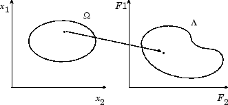 Вектор производительности F (x) отображает пространство параметров в пространство целевой функции, как показано в двух измерениях на рис. 9-1, Отображение из пространства параметров в пространство целевой функции.