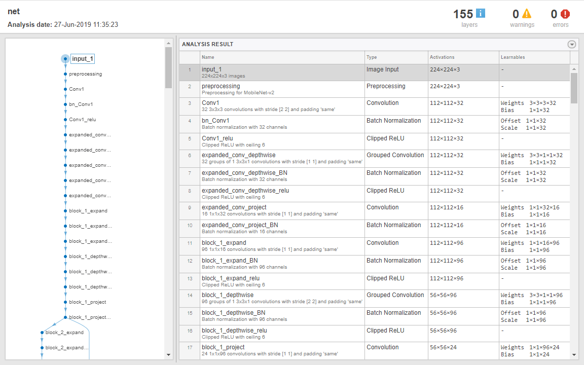 Объект net содержит DAGNetwork объект. Используйте analyzeNetwork Функция (Deep Learning Toolbox) используется для отображения интерактивной визуализации сетевой архитектуры, обнаружения ошибок и проблем в сети, а также для отображения подробной информации о сетевых уровнях. Информация о слое включает в себя размеры активизаций слоя и обучаемых параметров, общее количество обучаемых параметров и размеры параметров состояния повторяющихся слоев.