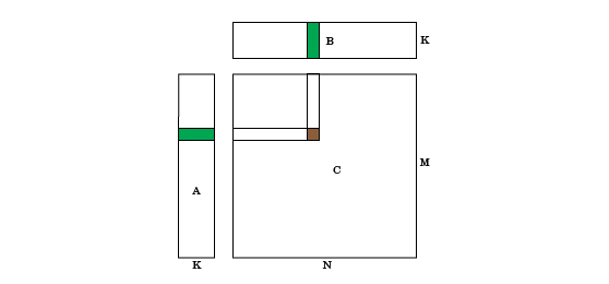 где F() является определяемой пользователем функцией. В этих операциях для вычисления соответствующего элемента выходной матрицы используют строку из одной входной матрицы и столбец из второй входной матрицы. Каждый поток перезагружает строку и столбец. Этот шаблон конструкции позволяет оптимизировать эту структуру, повторно используя данные и заставляя каждый поток вычислять несколько выходных элементов.