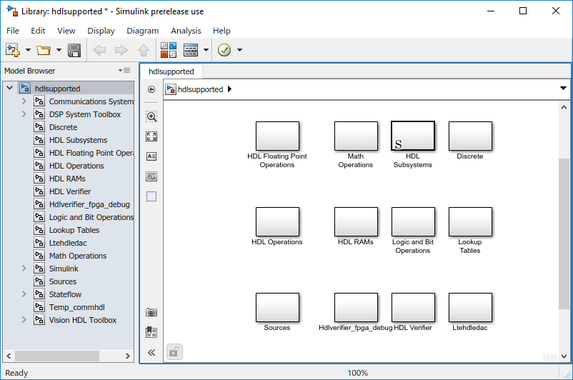 hdllib отображает блоки, которые поддерживаются для создания кода HDL и на которые у вас есть лицензия, в браузере библиотеки. Для создания моделей, совместимых с программным обеспечением HDL Coder™, используйте блоки из этого вида браузера библиотеки.