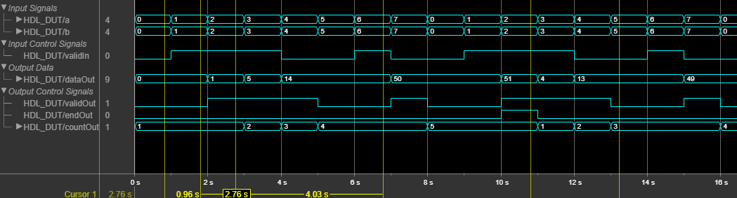 Первоначально при низком значении validIn значение dataOut равно нулю. В момент времени 1s, и startIn, и validIn становятся высокими. Следовательно, validOut становится высоким в следующем такте, и dataOut начинает производить действительные выходные данные накопления. Во время накопления dataOut принимает значения a и b из предыдущего тактового цикла. Например, в момент времени t = 2s, dataOut = 1 * 1 + 8 = 9.