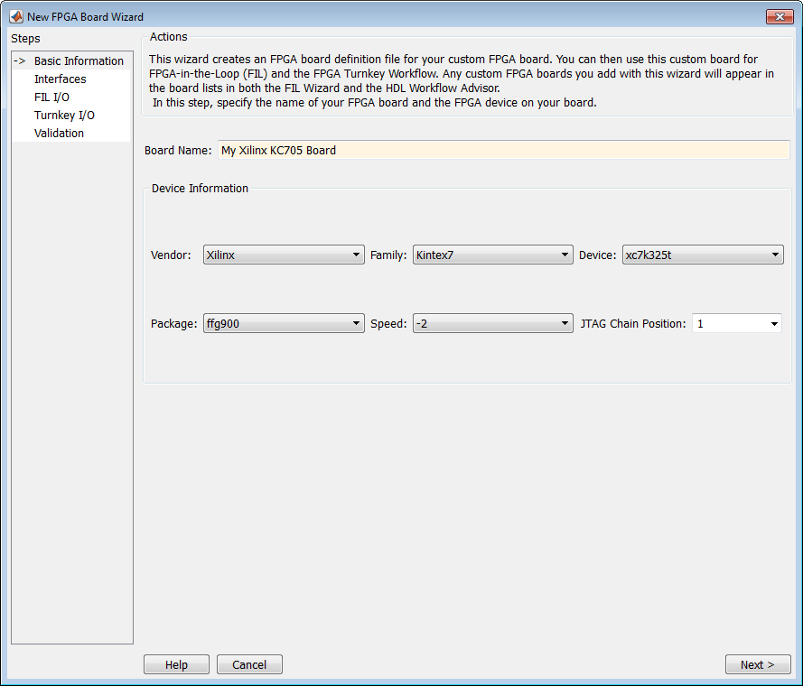 Для FPGA-in-the-loop можно использовать собственную сертифицированную плату FPGA, даже если она отсутствует в списке предварительно зарегистрированных плат FPGA, поставляемых MathWorks ®. С помощью мастера создания платы FPGA можно создать файл определения платы, описывающий пользовательскую плату FPGA.