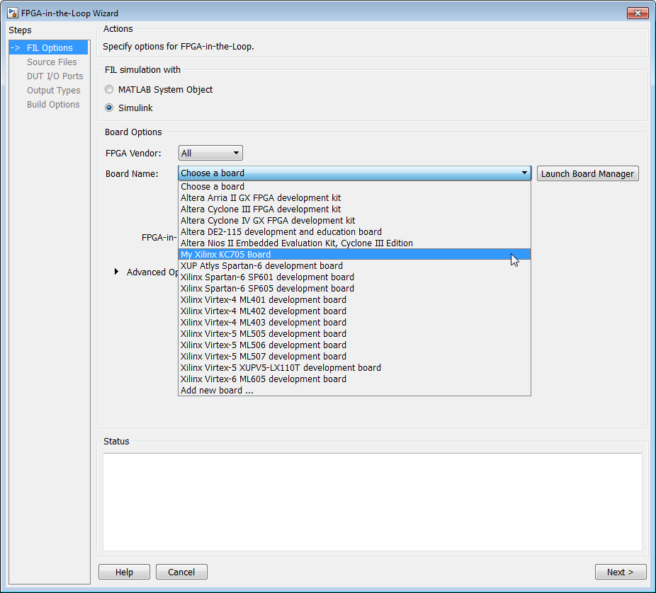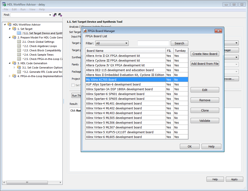 В списке плат появится плата Xilinx KC705, которую можно выбрать для моделирования FPGA-in-the-loop.