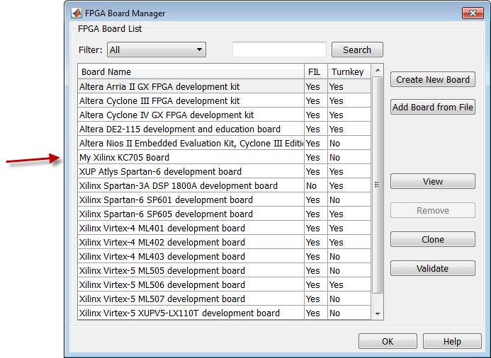 После сохранения файла определения платы выполняется возврат в FPGA Board Manager. Теперь в списке плат FPGA отображается новая определенная плата.