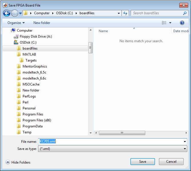 Нажмите Finish для выхода из мастера создания платы FPGA. Появится диалоговое окно Save As (сохранить как) с запросом местоположения файла определения платы FPGA. Для этого примера сохраните как C:\boardfiles\KC705.xml.