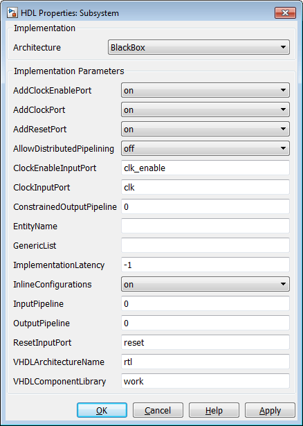 Параметры блока HDL, доступные для реализации «черного ящика», позволяют настраивать сгенерированный интерфейс. Сведения об этих параметрах см. в разделе Настройка интерфейса косимуляции черного ящика или HDL.