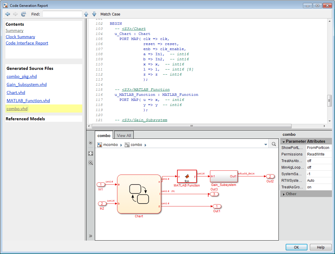 Для просмотра и анализа созданного кода рекомендуется переходить между кодом и моделью. В отчет о создании кода HTML можно включить веб-представление модели. Затем модель и созданный код можно совместно использовать вне среды MATLAB. При создании отчета веб-представление включает атрибуты блок-схемы, отображаемые в редакторе Simulink Editor, например, порядок выполнения сортировки блоков, свойства сигнала и типы данных порта.