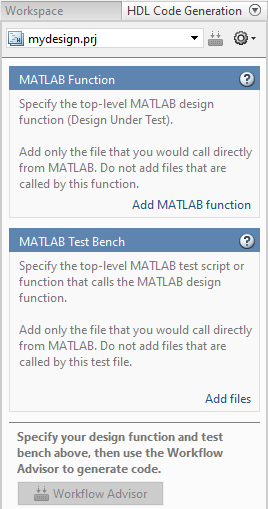 Сначала необходимо добавить в проект файл MATLAB, из которого требуется создать код. Добавьте только функцию верхнего уровня, вызываемую из MATLAB (тестируемый проект). Не добавляйте файлы, вызываемые этим файлом. Не добавляйте файлы с пробелами в именах. Путь не должен содержать пробелов, поскольку пробелы могут привести к сбоям генерации кода в определенных конфигурациях операционной системы.