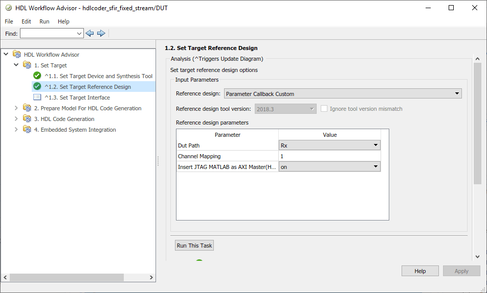 При открытии помощника по рабочему процессу HDL кодер HDL заполняет задачу Задать целевое ссылочное проектирование с указанным именем ссылочного проекта, версией инструмента, пользовательскими параметрами и опцией Вставить JTAG MATLAB как AXI Master (требуется верификатор HDL), которая имеет значение on.