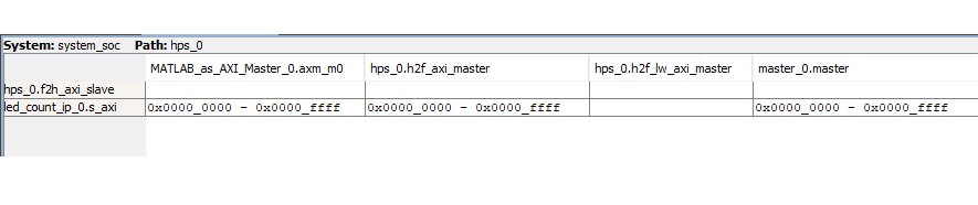 % ... %% Add custom design files % add custom Qsys design hRD.addCustomQsysDesign('CustomQsysPrjFile', 'system_soc.qsys'); hRD.CustomConstraints = {'system_soc.sdc','system_setup.tcl'}; % ... % add AXI4 slave interfaces hRD.addAXI4SlaveInterface( ... 'InterfaceConnection', {'hps_0.h2f_axi_master','master_0.master','MATLAB_as_AXI_Master_0.axm_m0'}, ... 'BaseAddress', {'0x0000_0000','0x0000_0000','0x0000_0000'},... 'InterfaceType', 'AXI4'... 'IDWidth', 14); % ...