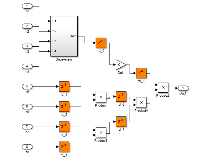На следующей диаграмме показана сгенерированная модель после распределенной конвейерной обработки перераспределяет задержку для уменьшения критического пути.