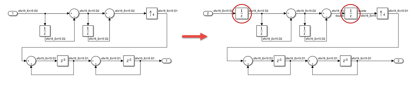 Блоки Rate Transition можно использовать для ввода входных и выходных регистров, но убедитесь, что регистры являются медленными и имеют нулевую фазу.