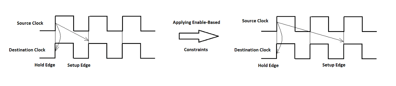 Например, рассмотрим многоцикловой путь, который занимает два тактовых цикла для распространения данных сверху от источника к регистру назначения. Этот сигнал показывает, как применение зависимостей на основе включения переопределяет границы установки и удержания. Этот фрагмент кода показывает это требование настройки и хранения в файле ограничений, который создается при включении ограничений многоциклового пути.