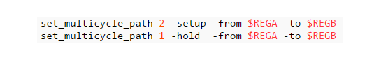 set_multicycle_path 3 -hold -from $reglist -to $reglist -quietОграничения многоциклового пути образуют группы регистров, основанные на включении, путем запроса списка соединений синтеза для ATTRIBUTE ключевое слово. Этот фрагмент кода отображает это ключевое слово в списке соединений синтеза при запуске любого из поддерживаемых целевых рабочих процессов.