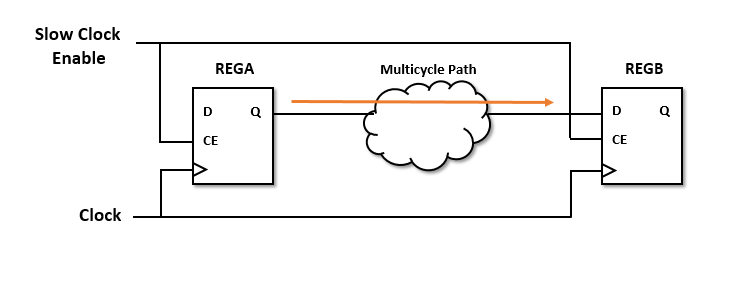На этом рисунке показан многоцикловый путь, который занимает определенное количество тактовых циклов, скажем N, для данных для распространения из REGA кому REGB. По умолчанию инструменты синтеза определяют границу установки на следующем активном рубеже синхронизации и границу удержания на том же активном фронте синхронизации по отношению к сигналу синхронизации назначения. Для многоцикловой траектории, которая занимает N тактовые циклы, ограничения переопределяют установку и границу хранения, чтобы обеспечить более длительное время распространения данных.