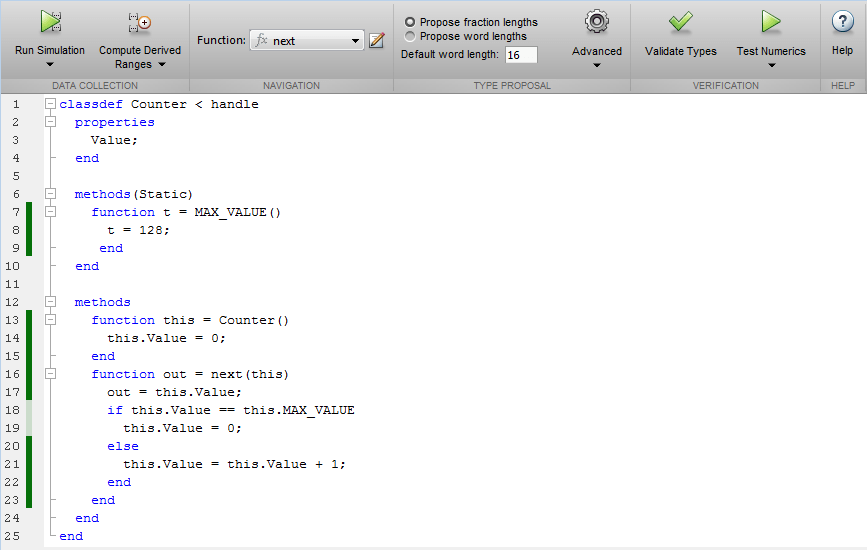По умолчанию в инструменте «Преобразование фиксированных точек» отображаются результаты покрытия кода. Тестовые файлы должны использовать алгоритм в полном рабочем диапазоне, чтобы диапазоны моделирования были точными. Качество предлагаемых типов данных с фиксированной точкой зависит от того, насколько хорошо тестовые файлы охватывают рабочий диапазон алгоритма с требуемой точностью. Проверка результатов покрытия кода позволяет убедиться в том, что тестовые файлы используют алгоритм надлежащим образом. Если покрытие кода является недостаточным, измените тестовые файлы или добавьте дополнительные тестовые файлы для увеличения покрытия. При моделировании нескольких тестовых файлов за один прогон инструмент отображает совокупный охват. Однако если указать несколько тестовых файлов, но запускать их по одному, инструмент отобразит охват последнего файла.