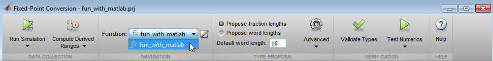 При выборе параметра «Проверить типы» выполняется проверка построения с использованием предлагаемых типов данных с фиксированной точкой. Если проверка прошла успешно, можно проверить численное поведение алгоритма MATLAB с фиксированной точкой.