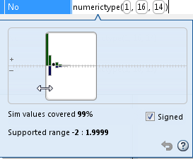 Гистограмма предоставляет диапазон предлагаемого типа данных и процент значений моделирования, которые охватывает предлагаемый тип данных. Веса битов отображаются вдоль оси X, а процент вхождений - вдоль оси Y. Каждый элемент в гистограмме соответствует биту в двоичном слове. Например, эта гистограмма отображает диапазон для переменной типа numerictype(1,16,14).