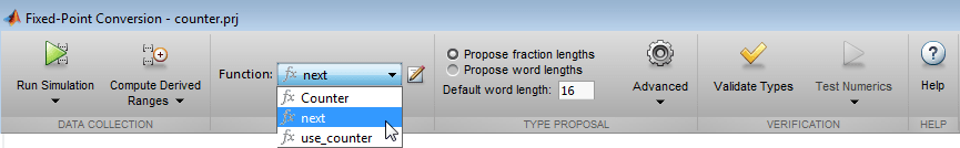 Код MATLAB с плавающей запятой можно преобразовать в код с фиксированной запятой с помощью инструмента «Преобразование с фиксированной запятой» в проектах HDL Coder™. Можно предложить типы данных на основе данных диапазона моделирования, производных (также известных как статические) данных диапазона или и того, и другого.