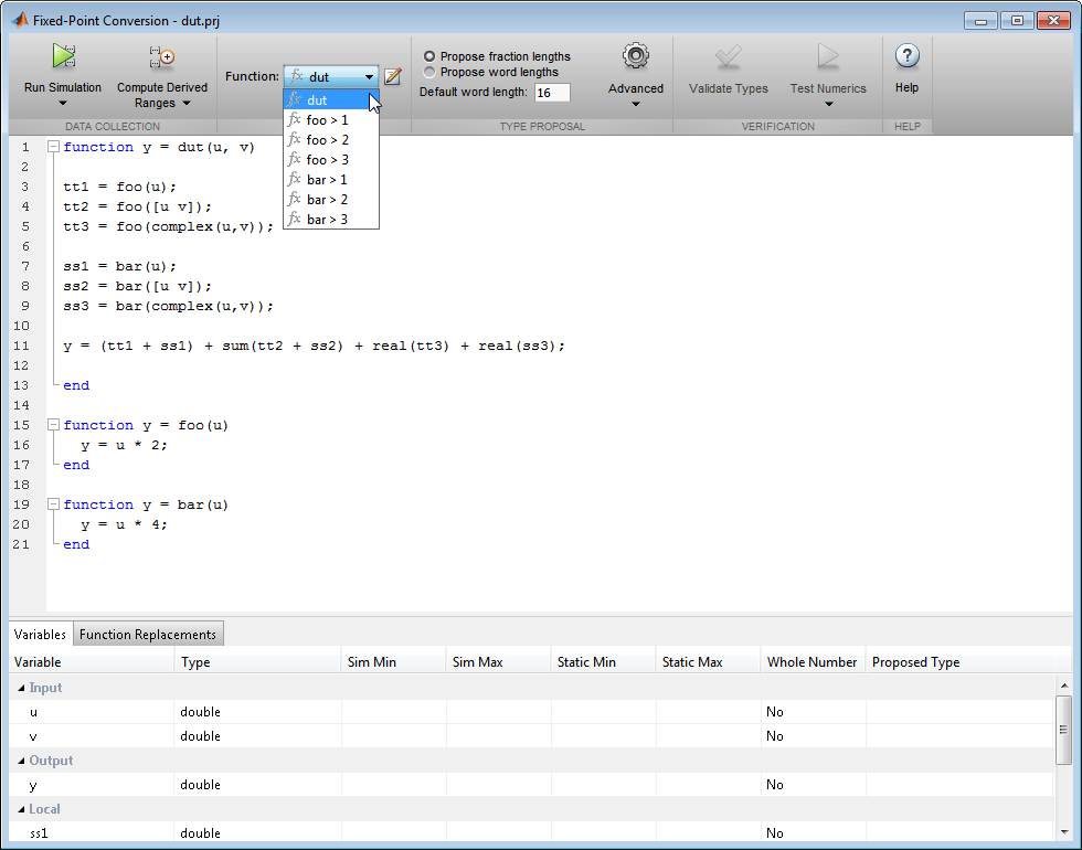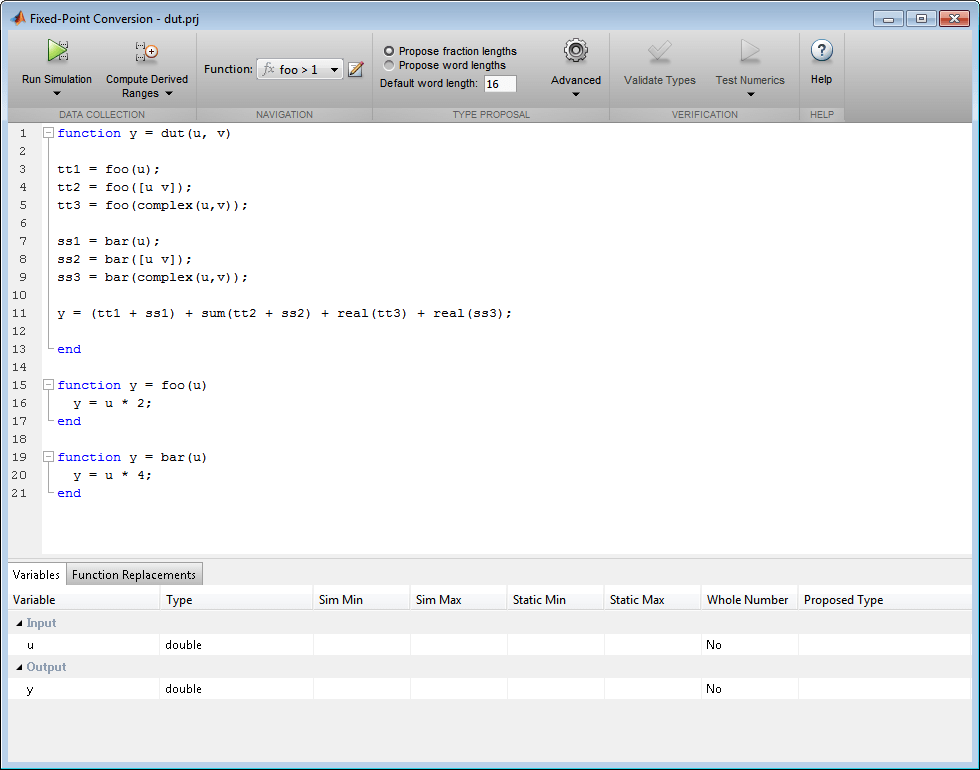 function y = dut(u, v) tt1 = foo(u); tt2 = foo([u v]); tt3 = foo(complex(u,v)); ss1 = bar(u); ss2 = bar([u v]); ss3 = bar(complex(u,v)); y = (tt1 + ss1) + sum(tt2 + ss2) + real(tt3) + real(ss3); end function y = foo(u) y = u * 2; end function y = bar(u) y = u * 4; end