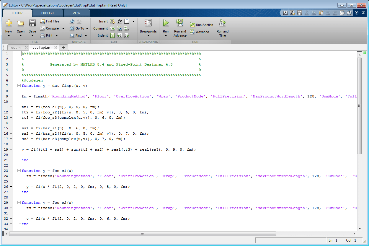 После преобразования на левой панели также отображается список выходных файлов, включая версию исходного алгоритма с фиксированной точкой. Если функция не является специализированной, преобразование сохраняет исходное имя функции в имени файла с фиксированной точкой и добавляет суффикс с фиксированной точкой. Например, версия с фиксированной точкой fun_with_matlab.m является fun_with_matlab_fixpt.m.
