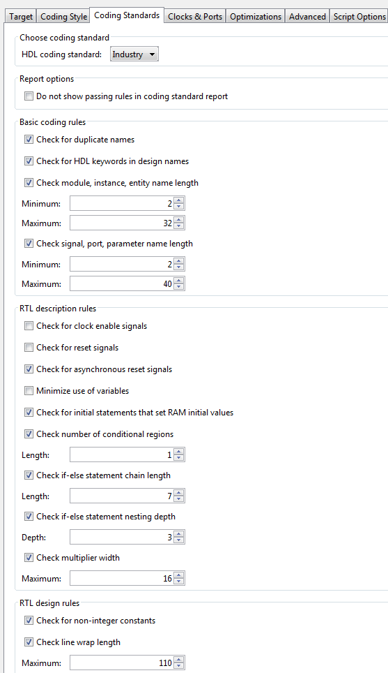 Можно создать стандартный отчет по кодированию HDL, который показывает, насколько хорошо созданный код соответствует отраслевым стандартам. При необходимости можно настроить стандартный отчет кодирования и стандартные правила кодирования.