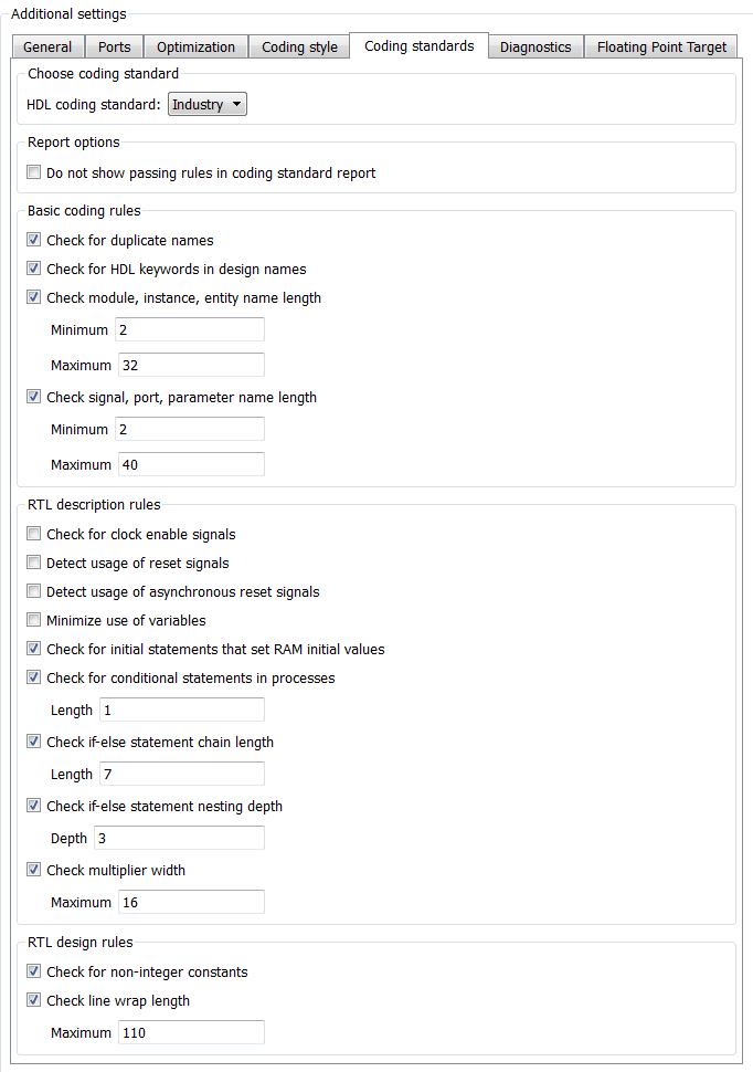 В задаче «Создание кода HDL» в меню «Параметры создания кода» > «Дополнительные параметры» выберите вкладку «Стандарты кодирования».