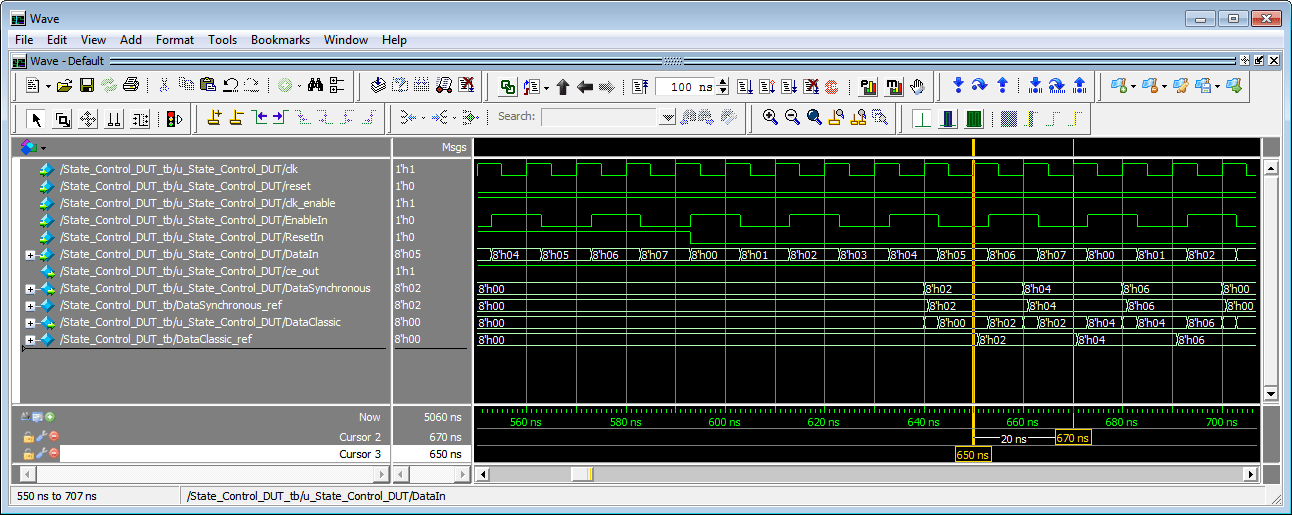 Когда сигналы ResetIn и EnureIn являются низкими, сигнал DataSynchronous сохраняет свое значение и изменяется только тогда, когда сигнал EnureIn становится высоким на следующем активном рубеже синхронизации. Значения сигнала DataClassic изменяются при низком уровне сигнала EnureIn при обработке новых входных значений. Значения сигнала DataClassic соответствуют значениям сигнала DataSynchronous, когда значение EnureIn становится высоким.