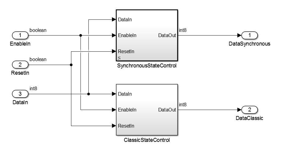 Подсистемы SynchronousStateControl и ClassicStateControl используют блок задержки с внешним сбросом и портом включения в Synchronous и Classic соответственно.