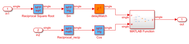 При создании кода HDL генератор кода сопоставляет блоки в модели Simulink с синтезируемыми собственными операторами с плавающей запятой. Чтобы увидеть, как генератор кода реализовал операции с плавающей запятой, откройте созданную модель. Блоки NFP math, NFP Sqrt и NFP trig соответствуют реализации с плавающей запятой блоков Reversal Sqrt, Reversal, sin и cos соответственно в исходной модели.