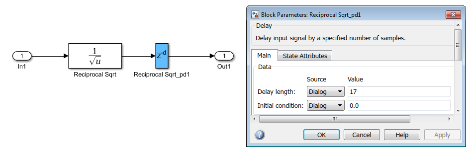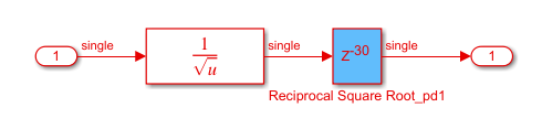 Каждый оператор с плавающей запятой имеет задержку. Генератор кода вставил дополнительную задержку согласования, поскольку задержка обратного Sqrt равна 30 и латентность взаимности 31. Задержка оператора равна длине задержки блока задержки внутри NFP блок. Например, если дважды щелкнуть значок NFP sqrt блок, вы можете получить задержку, глядя на длину задержки Delay блок. См. раздел Значения задержки операторов с плавающей запятой.