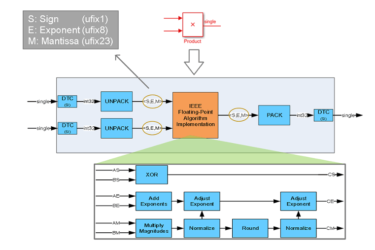 Unpack и Pack блоки преобразуют типы с плавающей запятой в знак, экспоненту и мантиссу. На рисунке S, E и M представляют знак, экспоненту и мантиссу соответственно. Эта интерпретация основана на IEEE-754 стандарте арифметики с плавающей запятой.