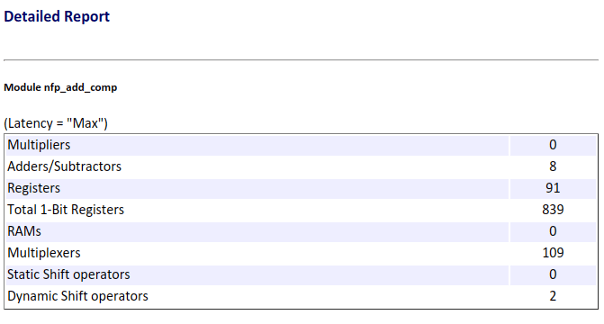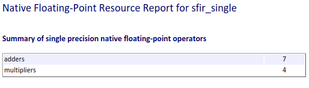 Подробный отчет показывает различные ресурсы, используемые блоками с плавающей запятой на указанном целевом устройстве. См. также Создание и использование отчетов о создании кода.