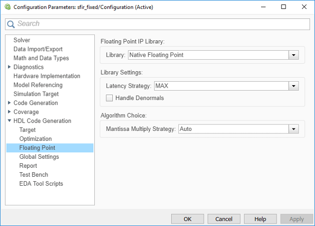 nfpconfig = hdlcoder.createFloatingPointTargetConfig('NATIVEFLOATINGPOINT'); hdlset_param('sfir_single', 'FloatingPointTargetConfiguration', nfpconfig);