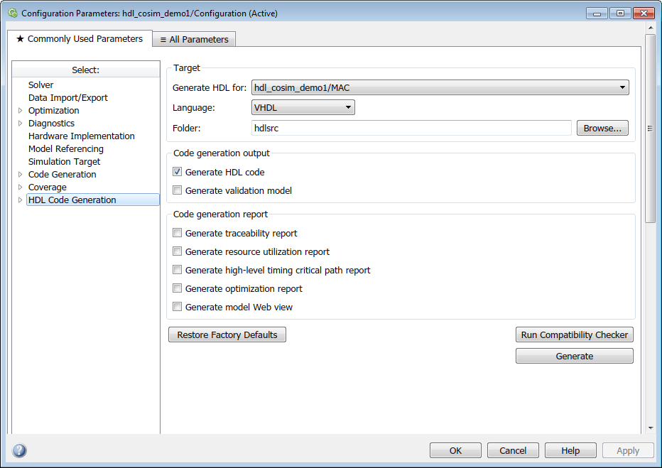 На панели «Создание кода HDL» диалогового окна «Параметры конфигурации» выберите DUT для создания кода. В этом случае это hdl_cosim_demo1/MAC.