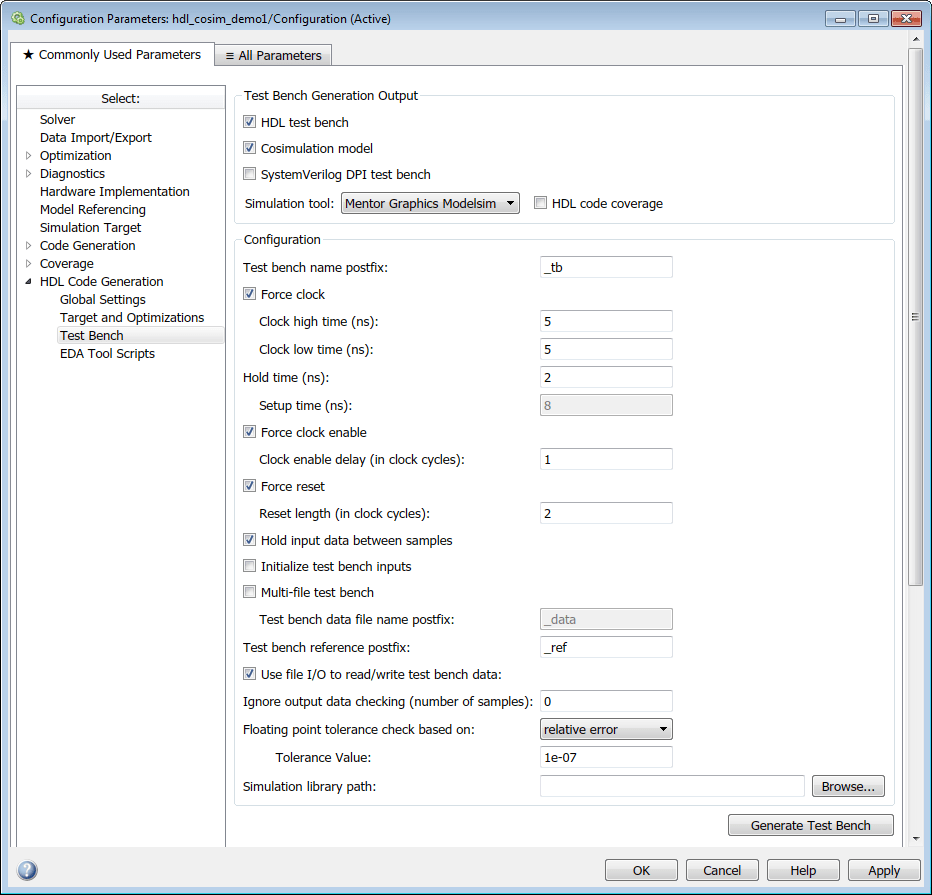 Сконфигурируйте необходимые параметры тестового стенда. Кодер HDL записывает настройки параметров в созданный файл сценария (см. Файл сценария Cosimulation).