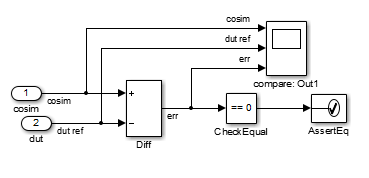 Для каждого выхода DUT кодер HDL генерирует подсистему проверки утверждения (Assert_OutN ). Подсистема вычисляет разницу (errмежду исходными выходами DUT (dut ref) и соответствующий выход косимуляции (cosim). Подсистема направляет результат сравнения в блок Assertion. Если результат сравнения не равен нулю, блок утверждения сообщает о расхождении.