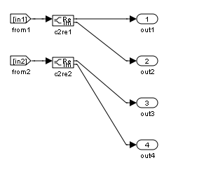 Созданная модель косимуляции автоматически разбивает сложные входные данные на вещественные и мнимые части. На следующем рисунке показан FromCosimSrc подсистема, принимающая два комплексных входных сигнала. Подсистема разбивает входные данные на действительные и мнимые части перед передачей их на выходы подсистемы.