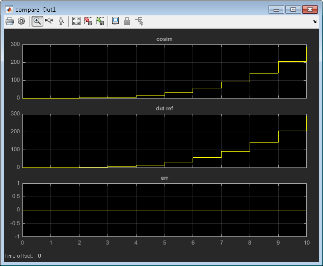 Compare подсистема в конце тракта косимуляции сравнивает выходной сигнал косимуляции с опорным выходным сигналом, полученным путем моделирования. Если сравнение обнаруживает расхождение, блок Assertion в Compare подсистема отображает предупреждающее сообщение. При необходимости можно отключить утверждения и управлять другими операциями Compare подсистема. Дополнительные сведения см. в разделе Управление утверждениями и отображениями объема.