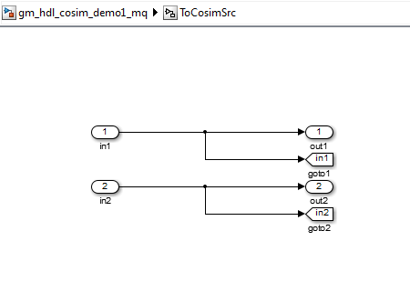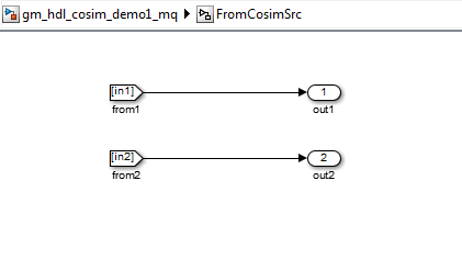 FromCosimSrc подсистема принимает те же входные сигналы, что и DUT. В gm_hdl_cosim_demo1_mq0 , подсистема просто передает входные данные в блок косимуляции ЛПВП. Сигналы некоторых других типов данных требуют дальнейшей обработки на данном этапе (см. Маршрутизация сигналов между путями моделирования и косимуляции).