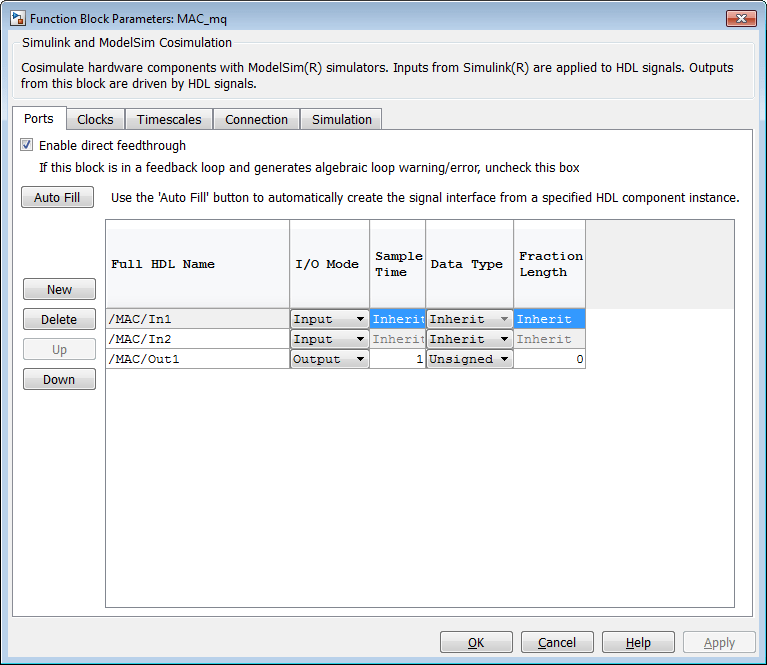 Комбинаторные выходные пути (вызванные отсутствием регистров в генерируемом коде) имеют задержку в один дополнительный цикл при косимуляции. Во избежание расхождений при сравнении выходных данных моделирования и косимуляции автоматически выбирается опция Разрешить прямой проход на панели Порты блока косимуляции ЛВП.