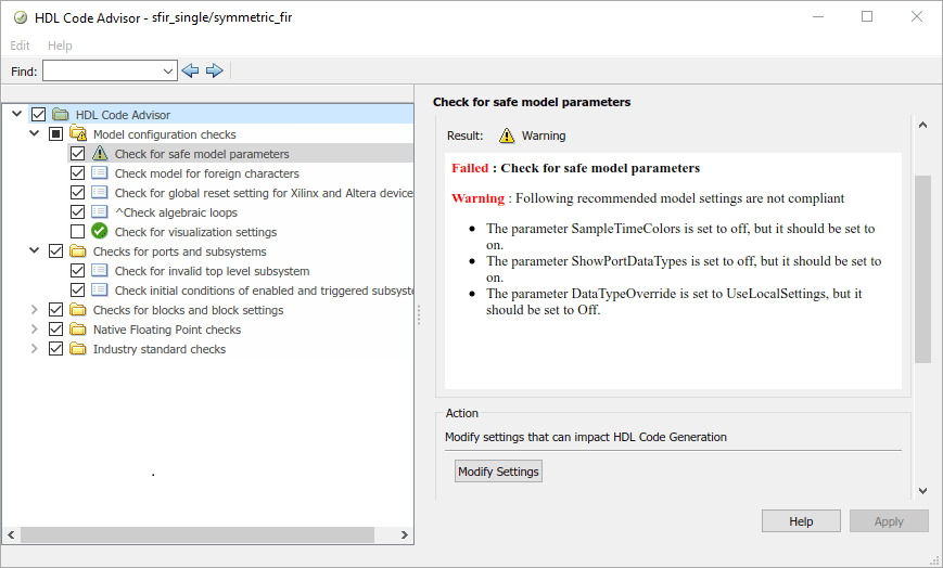 Чтобы применить правильные настройки конфигурации модели, о которых генератор кода сообщил в подпанели Результат (Result), нажмите кнопку Изменить настройки (Modify Settings). После нажатия кнопки Изменить настройки (Modify Settings) в подпанели Результат (Result) сообщается о примененных изменениях. Теперь можно запустить эту проверку.